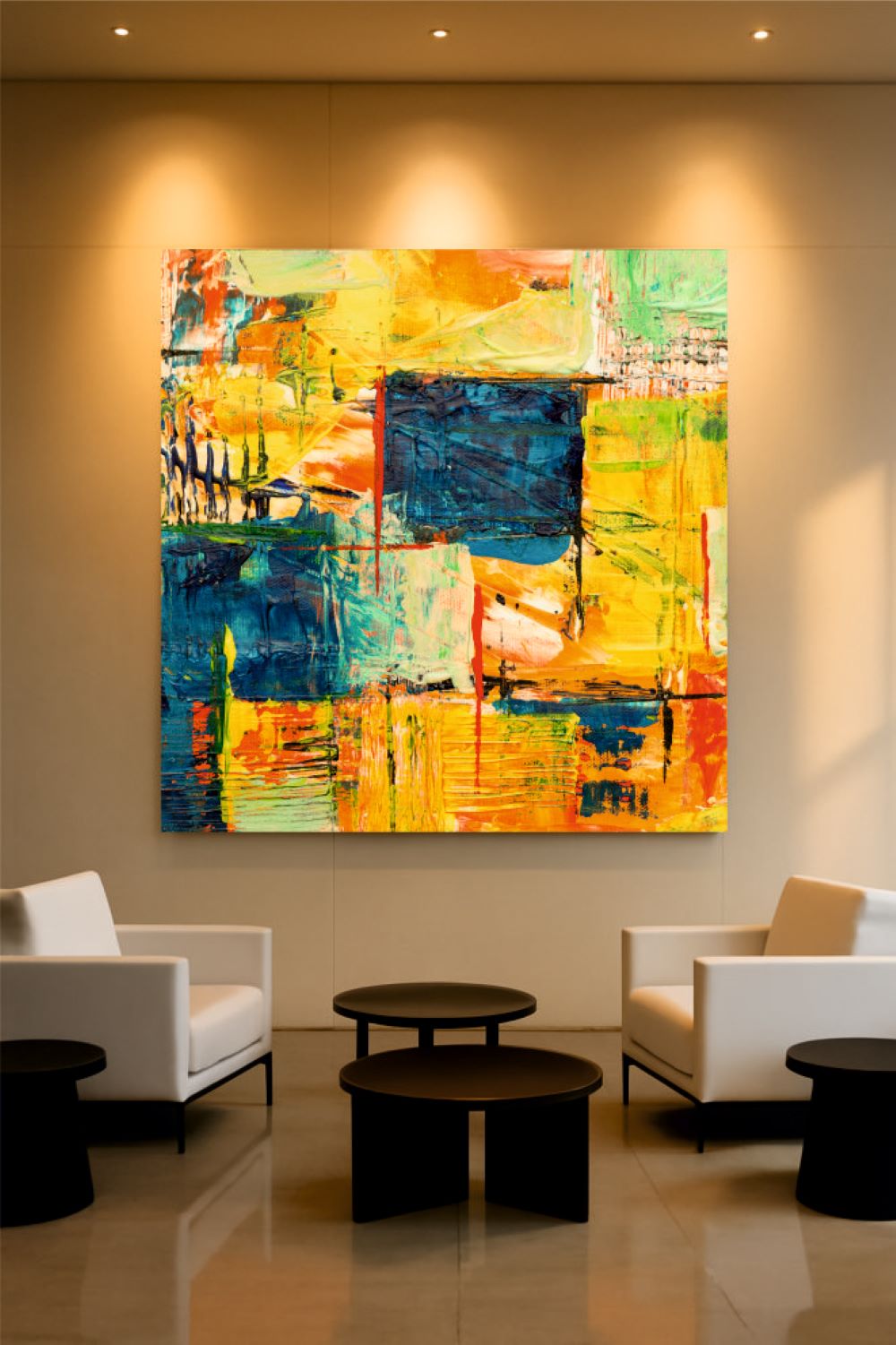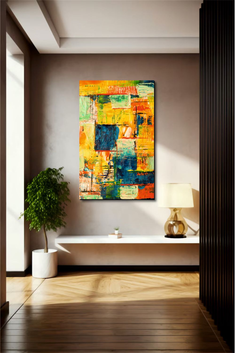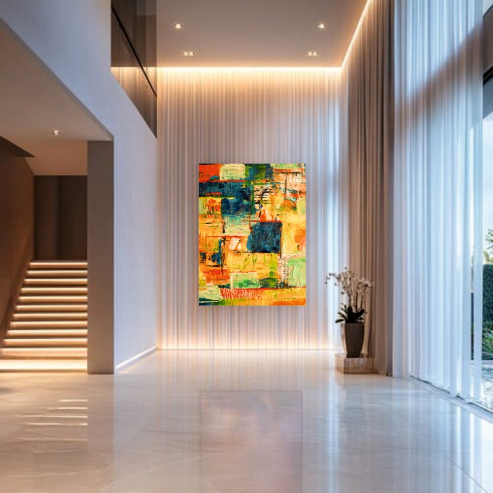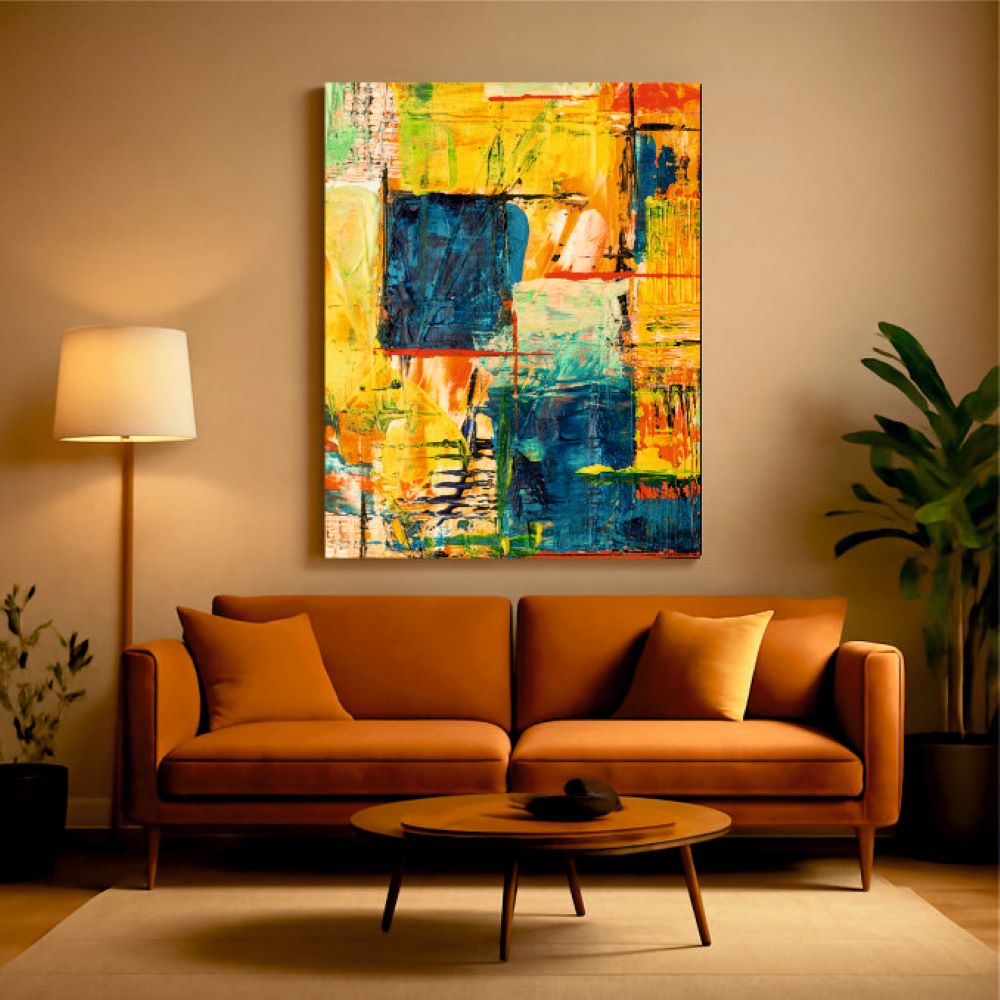 Enhance your walls with our designer wall glass. This piece features a 5mm toughened glass with high-definition digital printing. The polished edges on all four sides ensure a premium finish. It showcases a vibrant abstract painting with bold colors and textured brushstrokes. This dynamic mix creates an energetic and captivating visual experience.